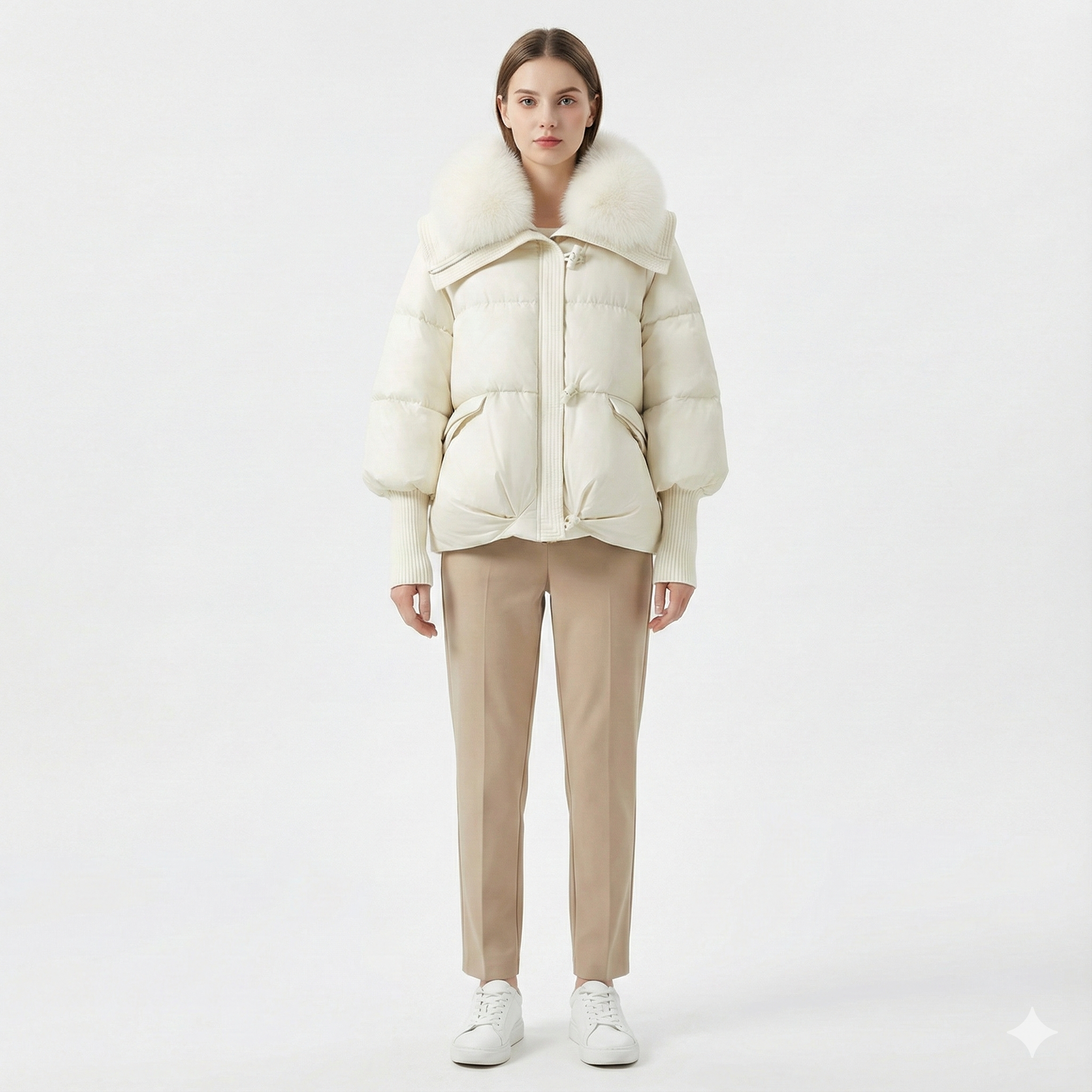• Luksuzni krzneni ovratnik: Mekan i voluminozan ovratnik od umjetnog krzna koji vas grije i dodaje dašak elegancije vašem outfitu.